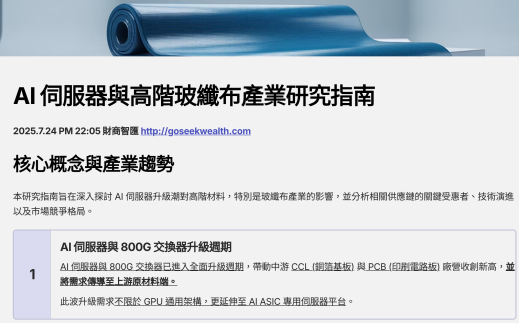 本研究指南旨在深入探討 AI 伺服器升級潮對高階材料,特別是玻纖布產業的影響,並分析相關供應鏈的關鍵受惠者、技術演進以及市場競爭格局。