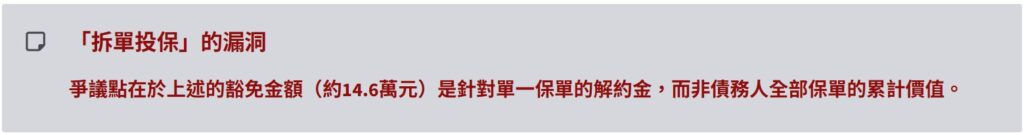 - 助長「全民耍無賴」:批評者認為,這使得債務人可以利用「拆單」方式投保,將大額資產拆成多張解約金均未超過14.6萬元的保單,從而合法規避強制執行,達到欠錢不還的目的。
