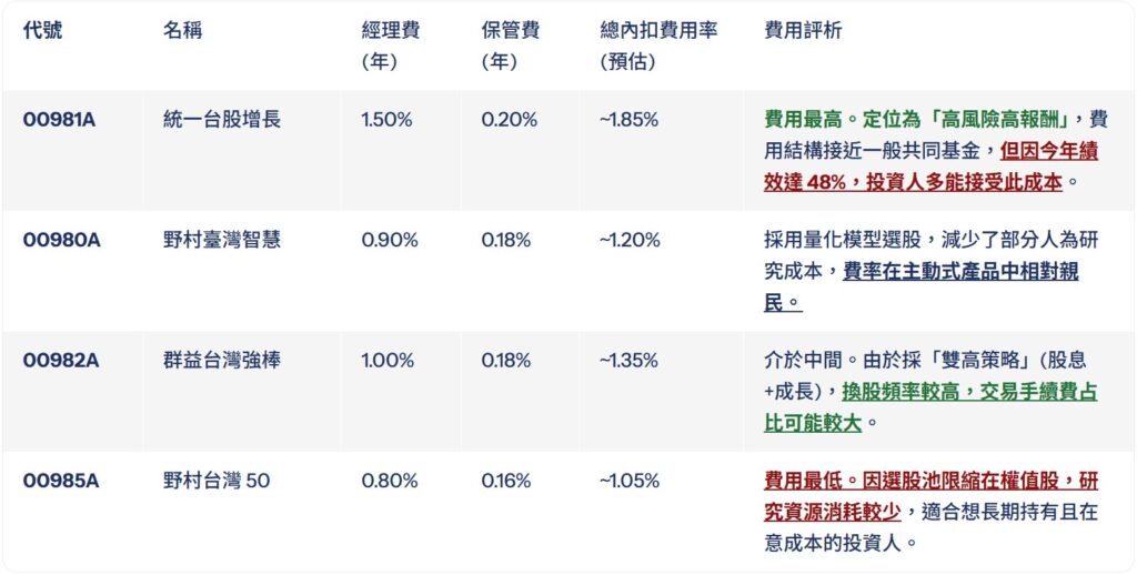 其餘熱門主動式ETF 內扣費用率比較