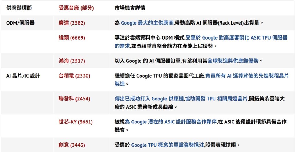 Gemini 3 的問世不僅是技術上的突破,更被視為點燃整個 AI 產業鏈需求的催化劑。由於 Google 對於 AI 伺服器的需求持續爆發,特別是對新一代 TPU(Tensor Processing Unit)的高度客製化運算需求,全面帶動了台灣上游供應鏈的營運表現。