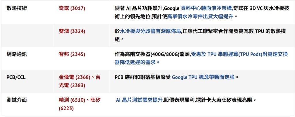 隨著企業加速導入 AI 方案,相關供應商將迎來成長契機。市場看好 Google 自研晶片 Ironwood 及 Gemini 3 後續產品的需求爆發,帶動相關供應鏈表現搶眼。