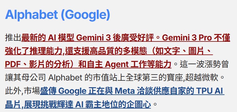 市場主要的 AI 股(如輝達和 Alphabet 等)的每股盈餘(EPS)正以每年大於 20% 的速度擴張,強勁的盈利增長為這些大型市值 AI 成長股提供了相對合理的估值支撐。