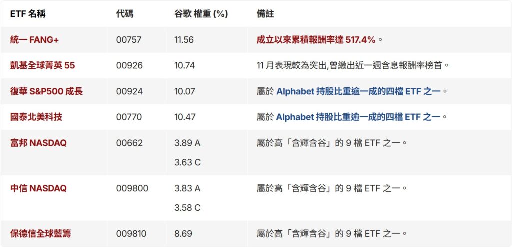 透過鎖定高「含輝(Nvidia)含谷(Alphabet/Google)」權重的海外 ETF 產品,有效參與大型科技巨頭的成長